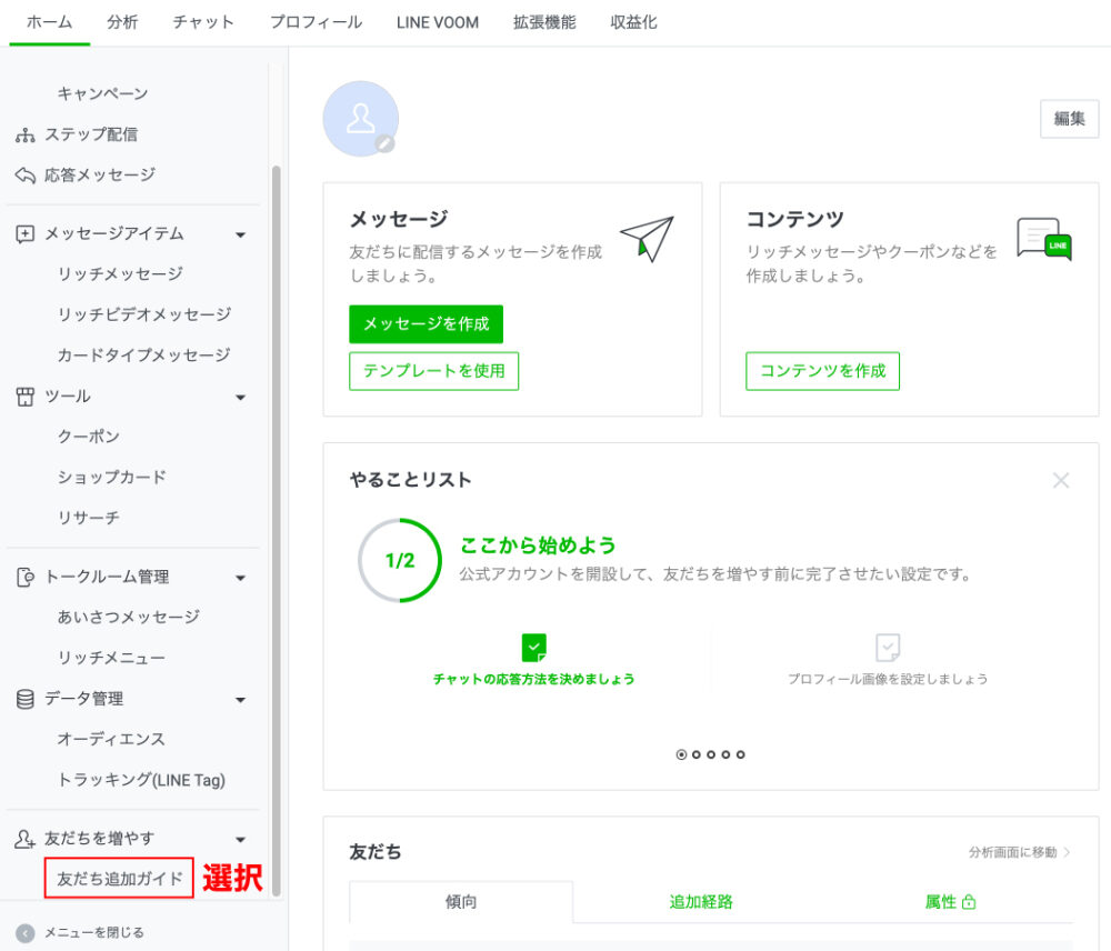 アカウントを選択すると下記画面(ホーム画面)が開くので、「友だちを増やす」フォルダ内の「友だち追加ガイド」を選択してください。